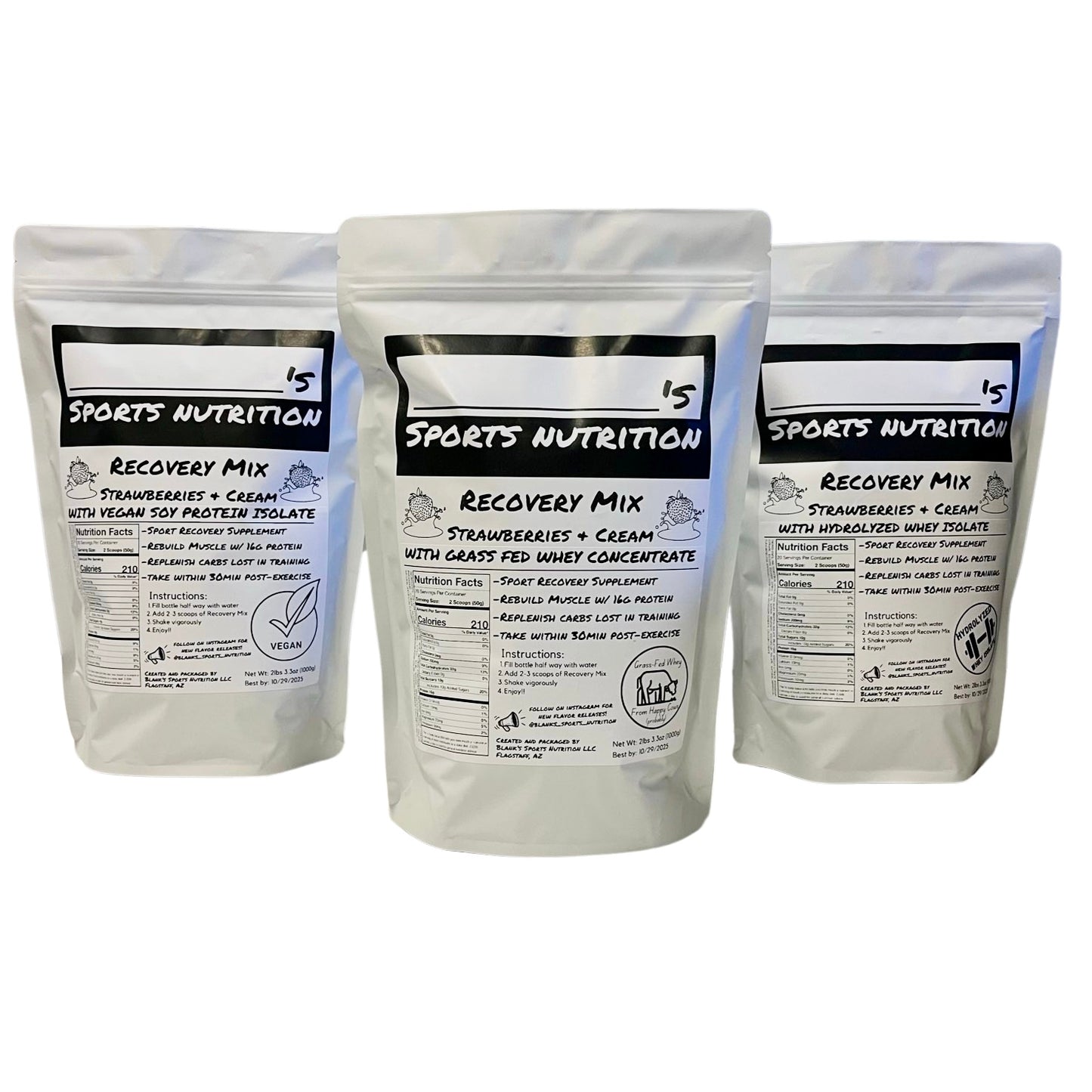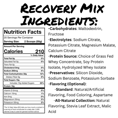 Our premier post-workout recovery drink! With 16g of protein and 32g of carbs the Blank's Recovery Mix will be a new staple in your sports nutrition inventory! With your choice of grass fed whey concentrate, soy protein isolate, or hydrolyzed whey isolate, there is a variant for everyone.